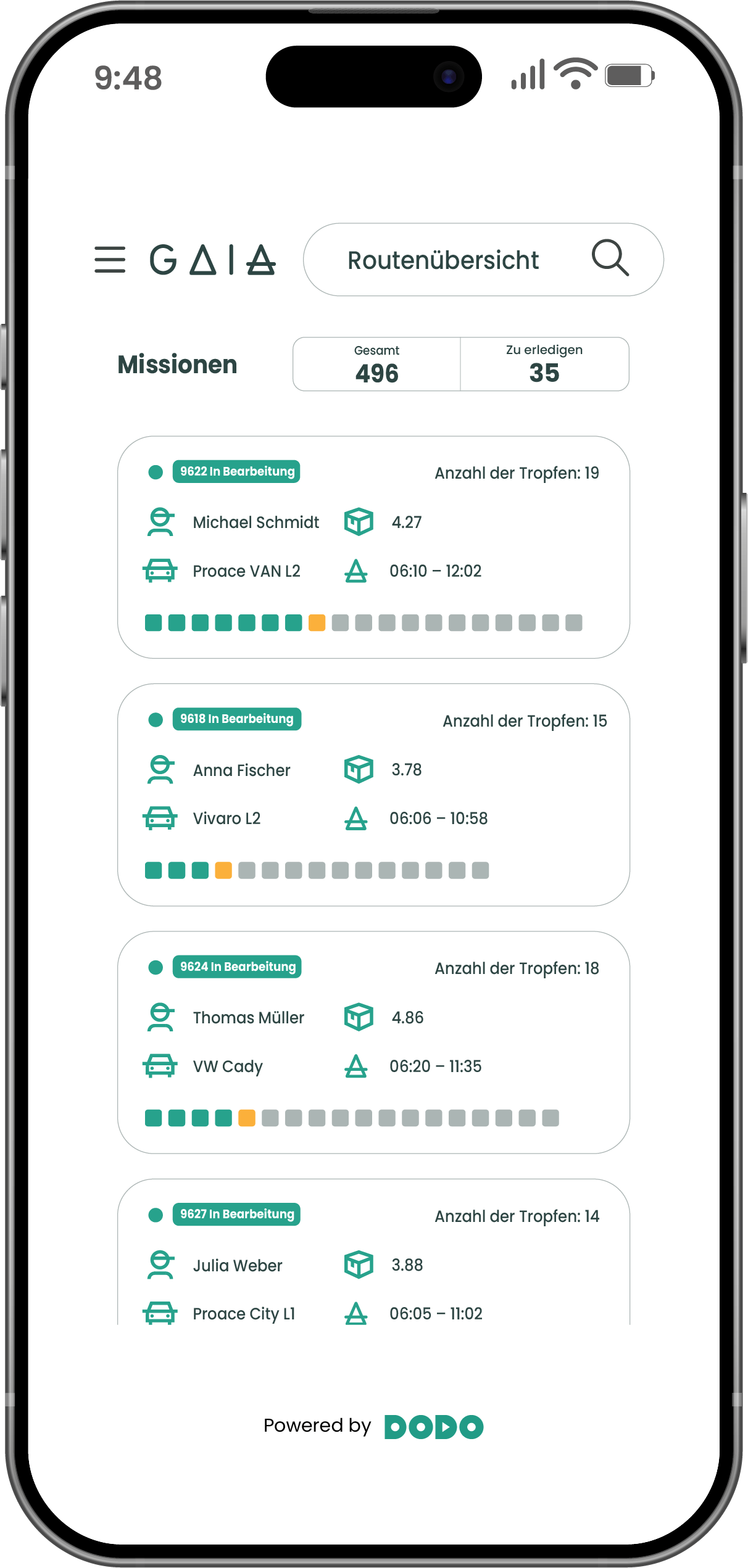 Wir spezialisieren uns auf das Segment der letzten Meile. Es ist dieser letzte Teil des Wegs zum Kunden, der darüber entscheidet, wie zufrieden der Kunde mit Ihrem Unternehmen sein wird. Deshalb nutzen wir bei DODO unsere eigene Logistikplattform GAIA, die für eine schnelle und zuverlässige Lieferung sorgt.